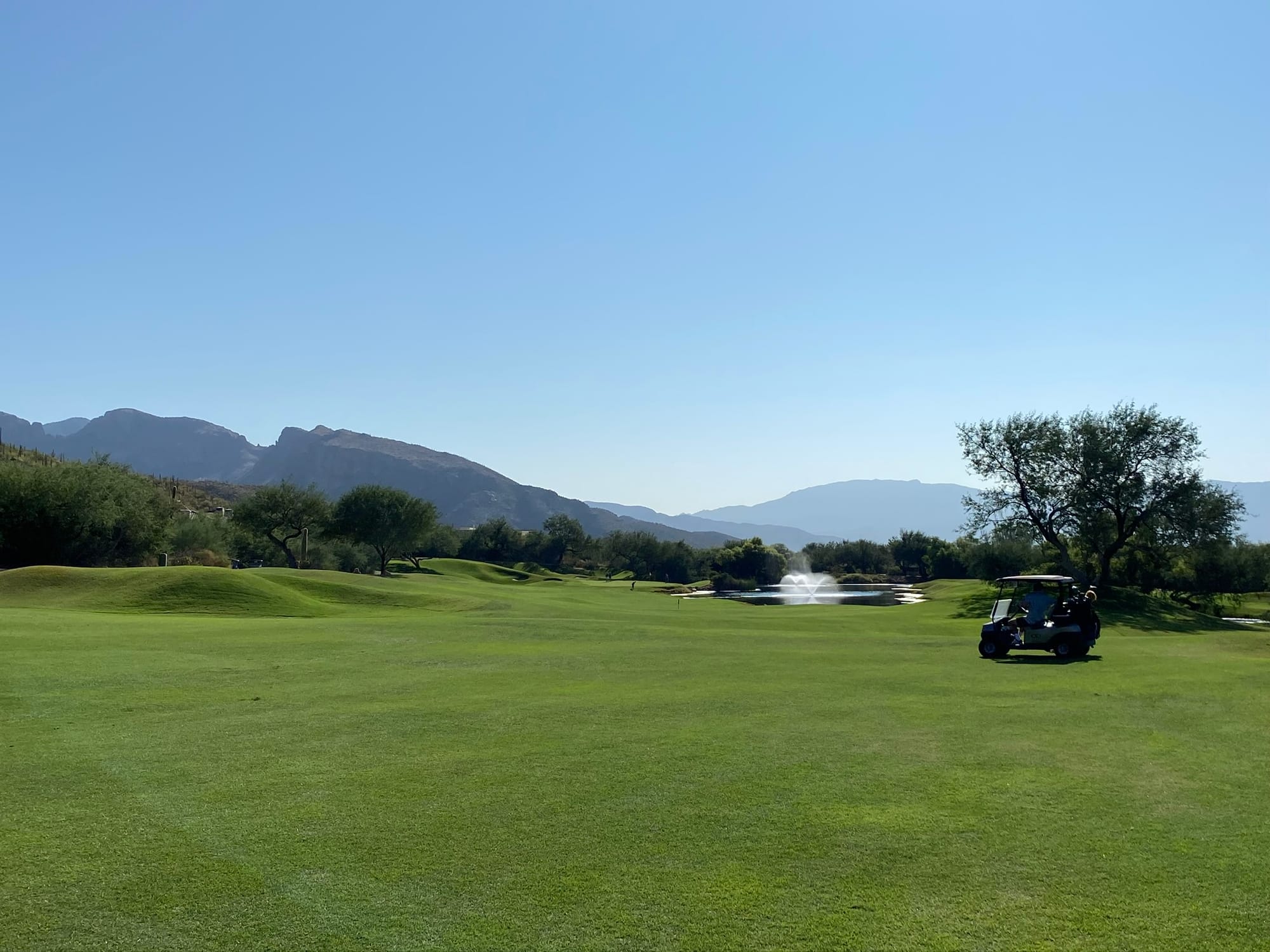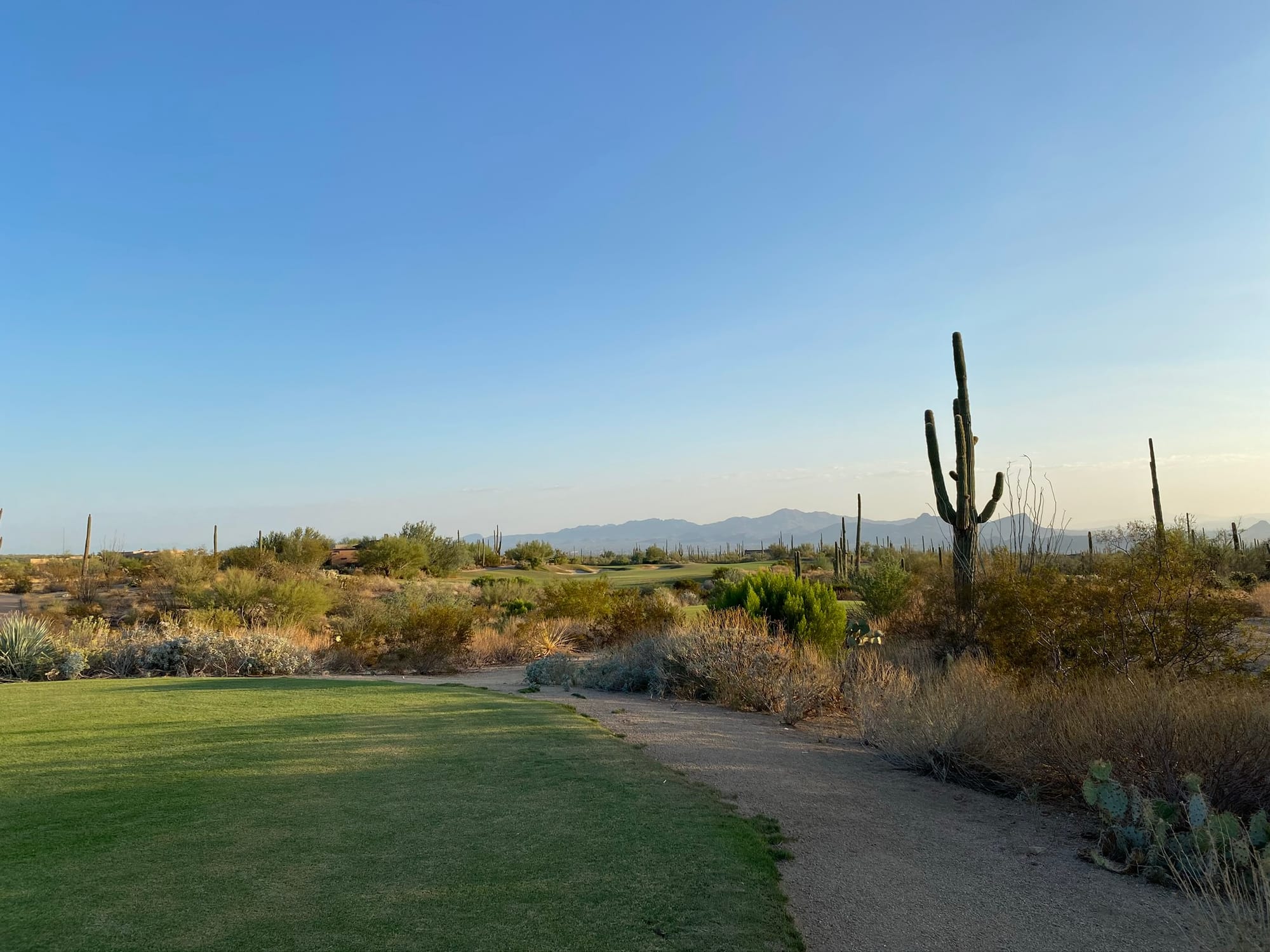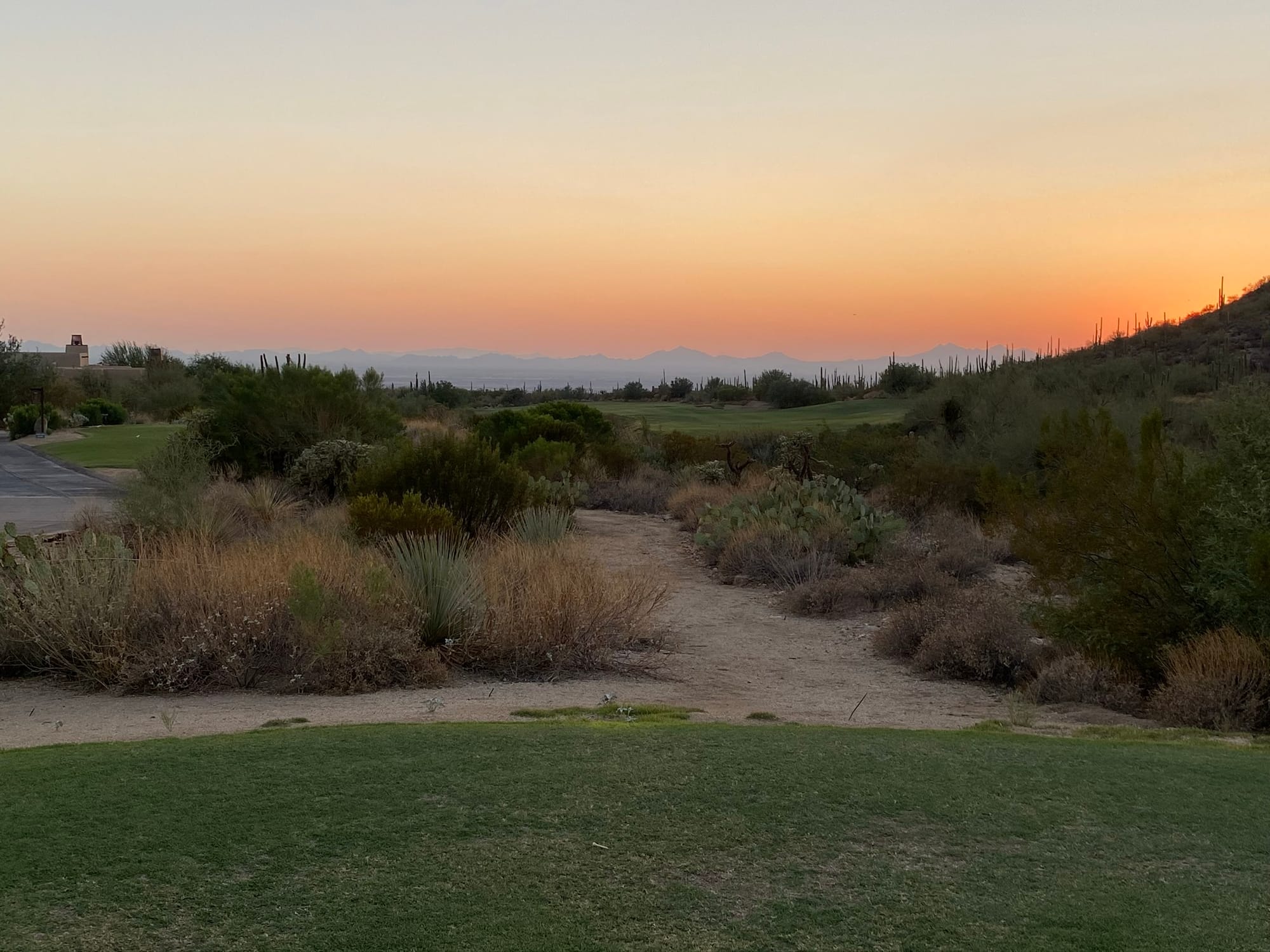 Word of advice from hard‑earned experience: when the sun drops in Tucson, it doesn’t ease into darkness—it falls into it. One minute you’re lining up a shot, the next you can barely see your cart. And if you stray too far from the course, you might discover (as we did) that golf carts shut down the moment they leave their designated zone. Nothing humbles you faster than pushing a dead cart down a public road in pitch‑black desert night after playing 36 holes.