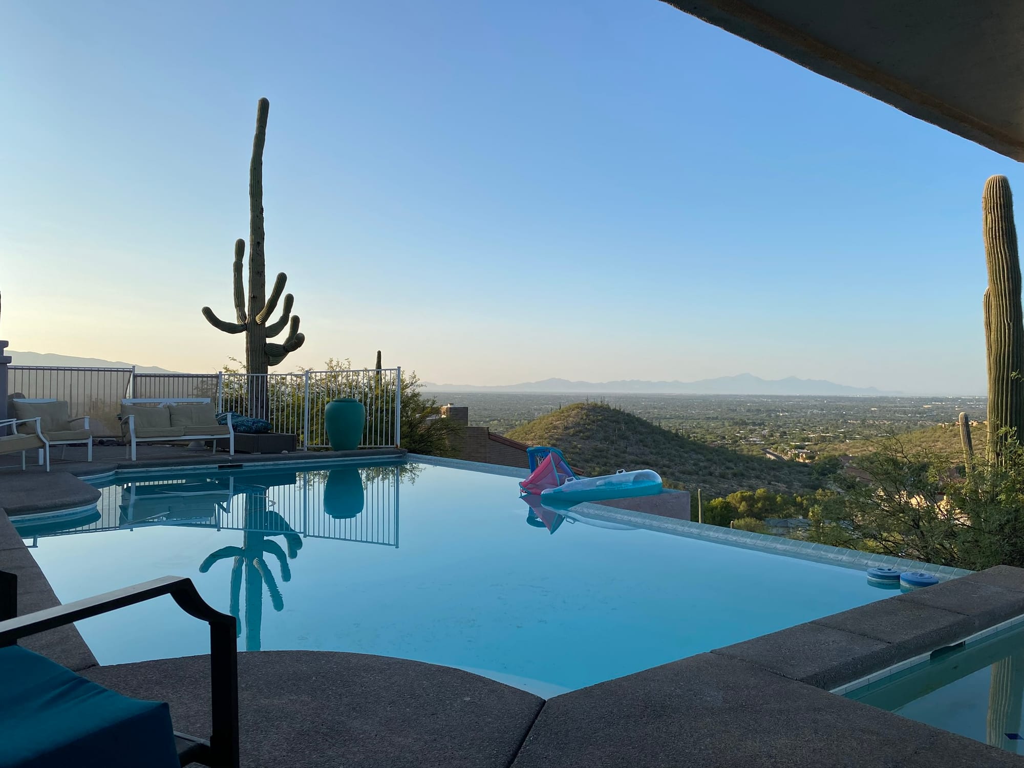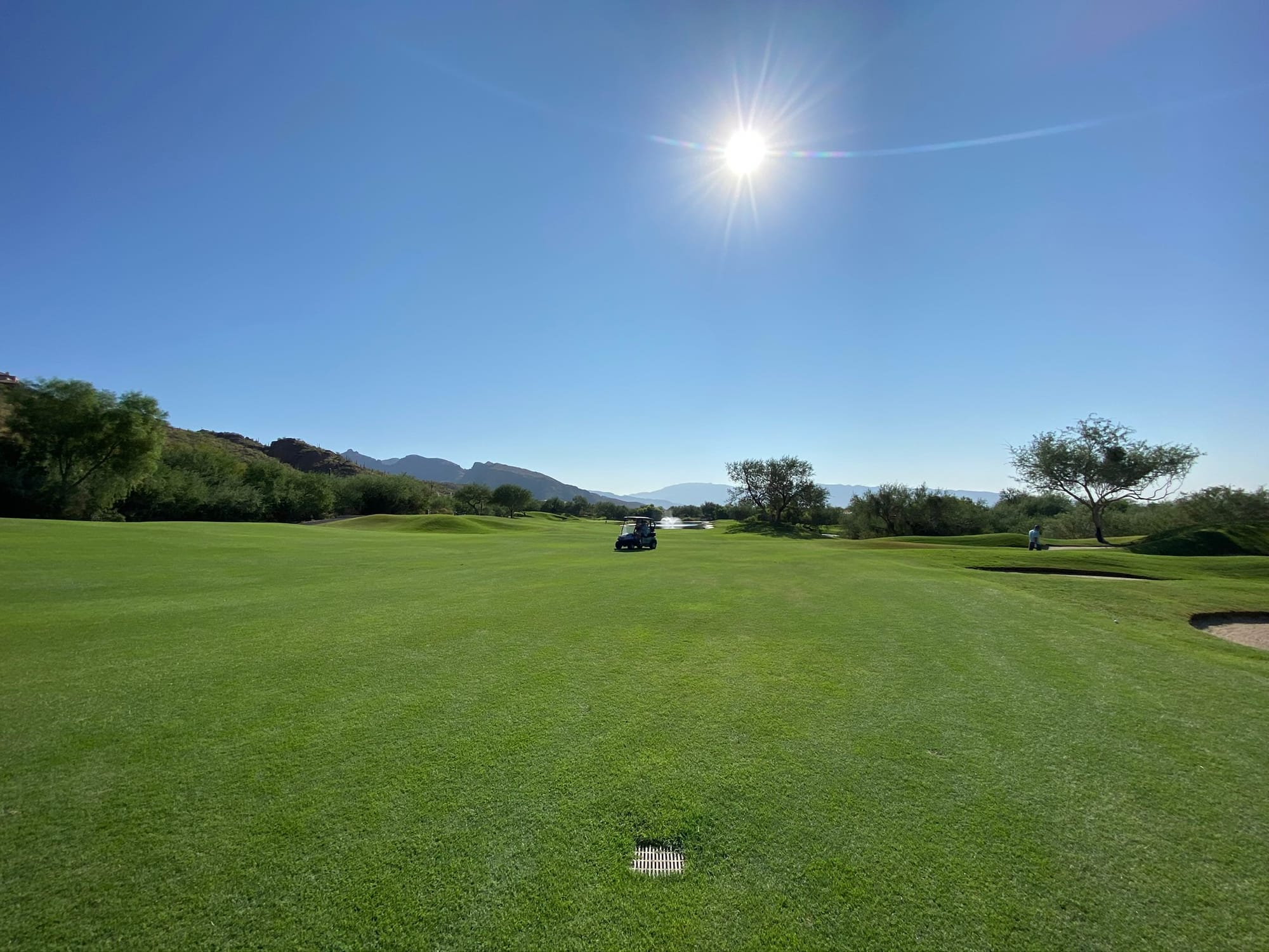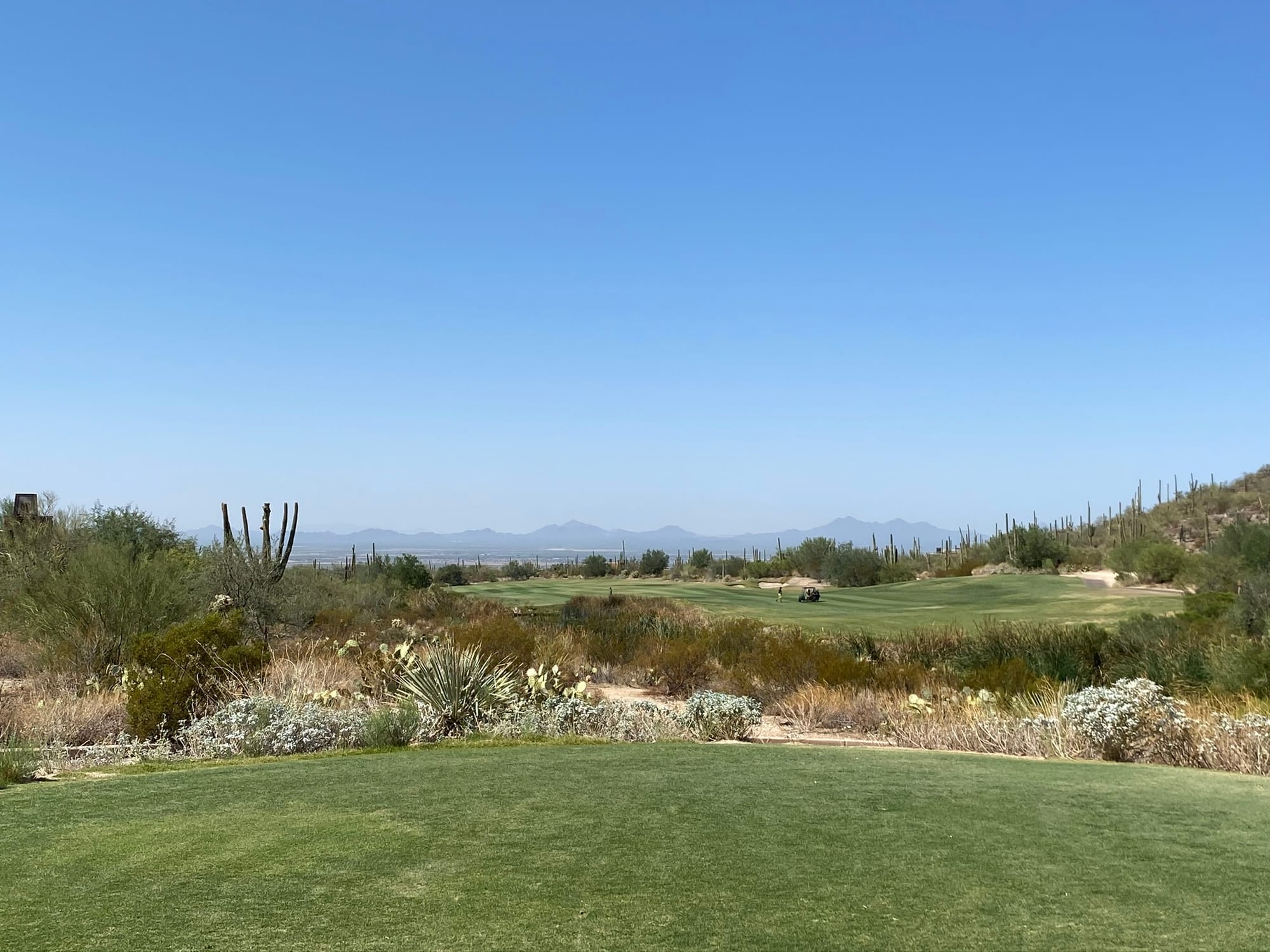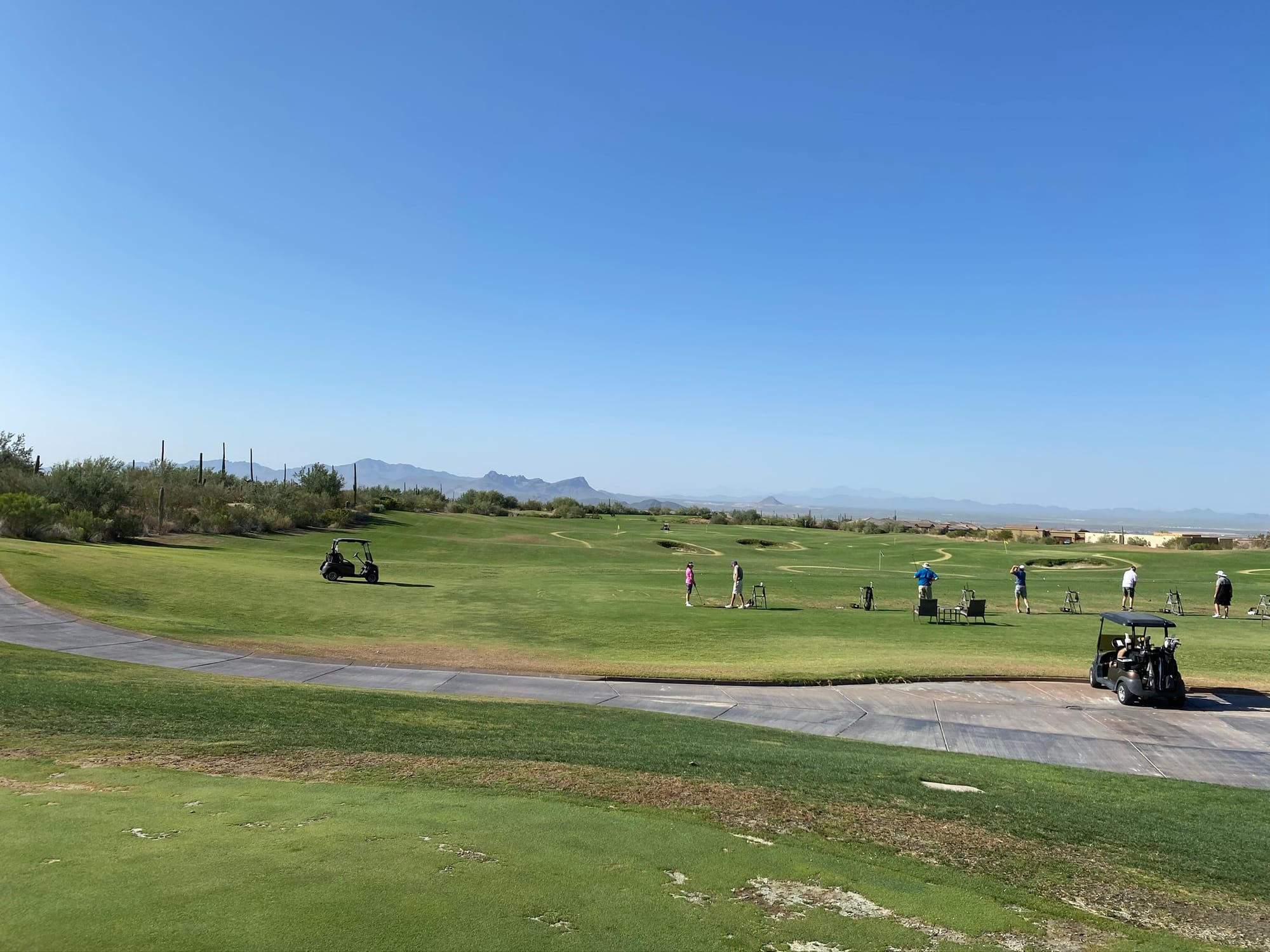 Word of advice from hard‑earned experience: when the sun drops in Tucson, it doesn’t ease into darkness—it falls into it. One minute you’re lining up a shot, the next you can barely see your cart. And if you stray too far from the course, you might discover (as we did) that golf carts shut down the moment they leave their designated zone. Nothing humbles you faster than pushing a dead cart down a public road in pitch‑black desert night after playing 36 holes.